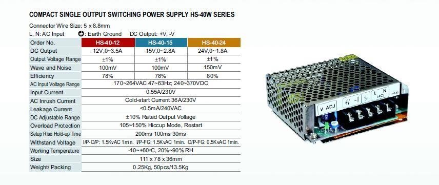 Průmyslový zdroj 12V=/40W spínaný HS-40/12, CARSPA; Parametry a specifikace: - AC Rozsah vstupního napětí zvolen pomocí přepínače; - Nízká hmotnost, vysoká účinnost; - Ochrany: Zkratu / proti přetížení; - Chlazení proudícím vzduchem; - LED indikátor