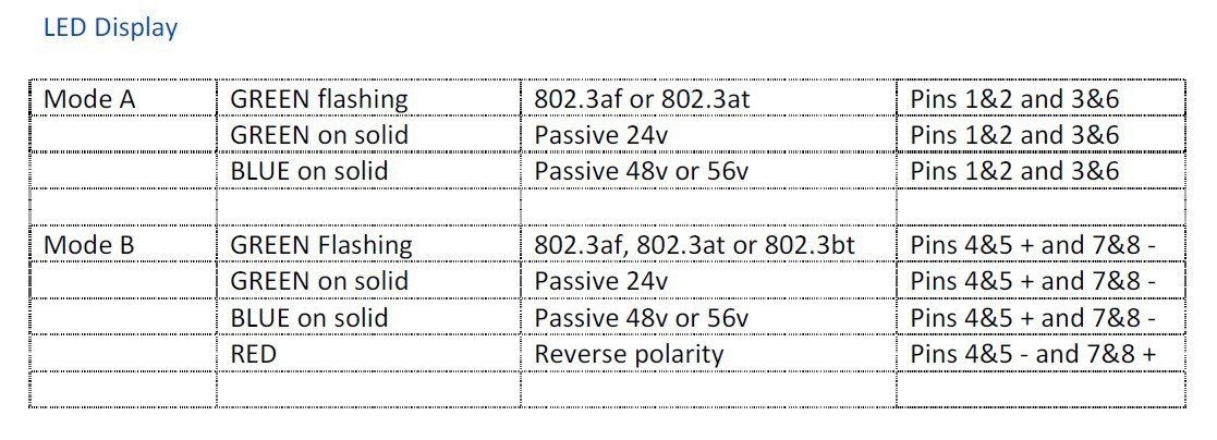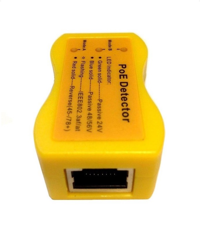 Lze použít jak v případě pasivního PoE, tak k detekci standardu 802.3af, 802.3at, 802.3bt s 568A/568B nebo obrácené PoE polarity.