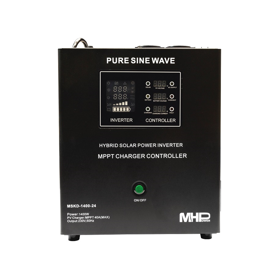 Záložní zdroj MHPower MSKD-1400-24, UPS, 1400W, čistý sinus, 24V, solární regulátor MPPT Tento Sinusový napájecí zdroj se používá k napájení elektrických zařízení vyžadujících střídavé napětí 230V. Při dodávce elektřiny jsou napájeny připojené spotřeb