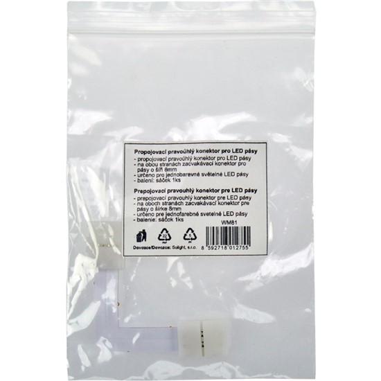 - propojovací pravoúhlý konektor pro LED pásy; - na obou stranách zacvakávací konektor pro pásy o šíři 8mm; - určeno pro jednobarevné světelné LED pásy; - balení: sáček 1ks