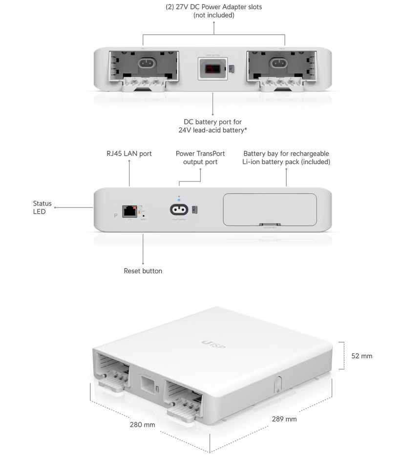 UISP-P lze napájet jedním nebo dvěma zdroji UACC-Adapter-PT-120W, které jsou k zakoupení samostatně. Přiopjením jednoho zdroje získáte výstupní výkon 100W, se dvěma zdroji je pak možné využít dvojnásobný výkon 200W. Pro funkci zálohovoání je součástí balení Li-ion battery pack s výkonem 115 Wh a externě lze připojit také olověnou baterii s napětím 24V.