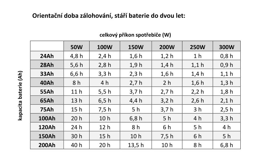Příklad: Oběhové čerpadlo s trvalým příkonem 50W je schopna tato sestava zálohovat až 6,5hod. Více naleznete v orientační tabulce v galerii produktu.