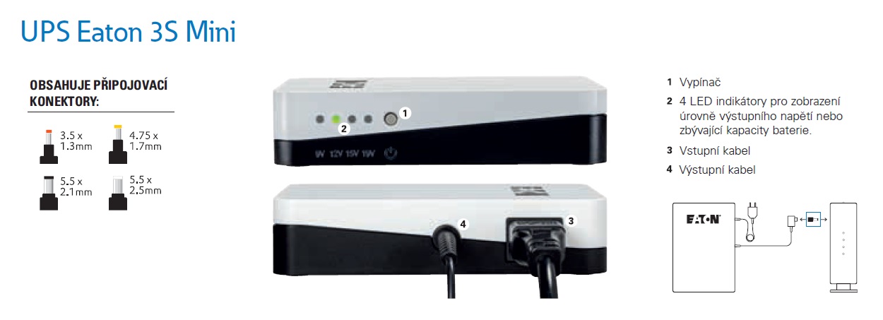EATON UPS 3S Mini 36W DC, pro zálohu zařízení s napájení 9 V / 12 V / 15 V / 19 V , 4 typy konektorů
