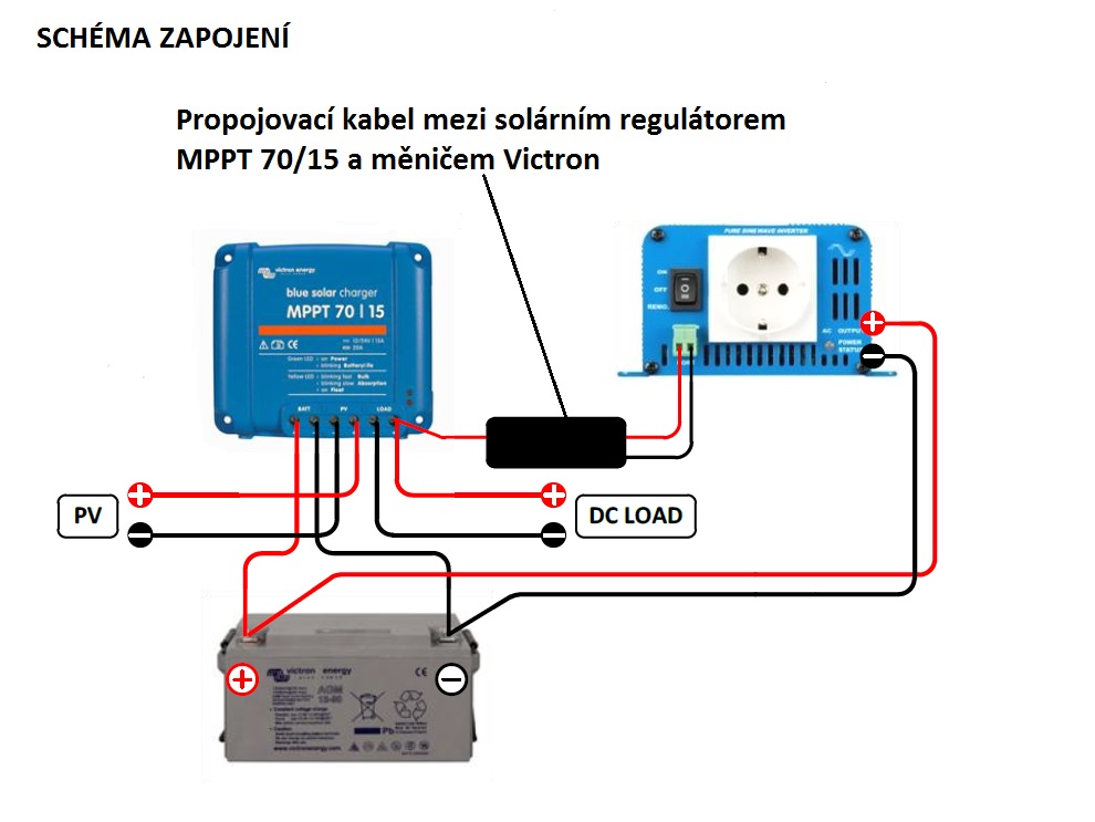 Kabel pro propojení solárního regulátoru MPPT 70/15 se střídači Victron Phoenix 12/180, 24/180, 12/350, 24/350, s modelovou řadou  Phoenix Inverter C a MultiPlus C. Pomocí tohoto kabelu dochází k automatickému vypnutí měniče (odpojení napájení spotřebičů měniče). Jde o ochranu proti hlubokému vybití baterie.