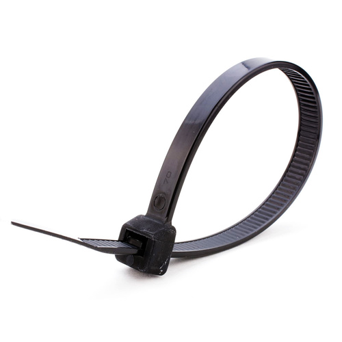 Stahovací páska 4,8x450mm černá, plast, 1ks; Specifikace: Délka: 450mm; Šířka: 4,8 mm; Pracovní teplota: -40C až +85C. Materiál - polyamid 66 (výrobce Dupont and Solutia,USA); Odolné vůči UV záření; Balení: 1ks; Barva: černá