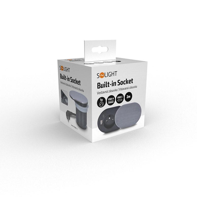 Solight PP124USBC vestavná zásuvka s posuvným víčkem, USB A+C nabíječka, 2m, stříbrná