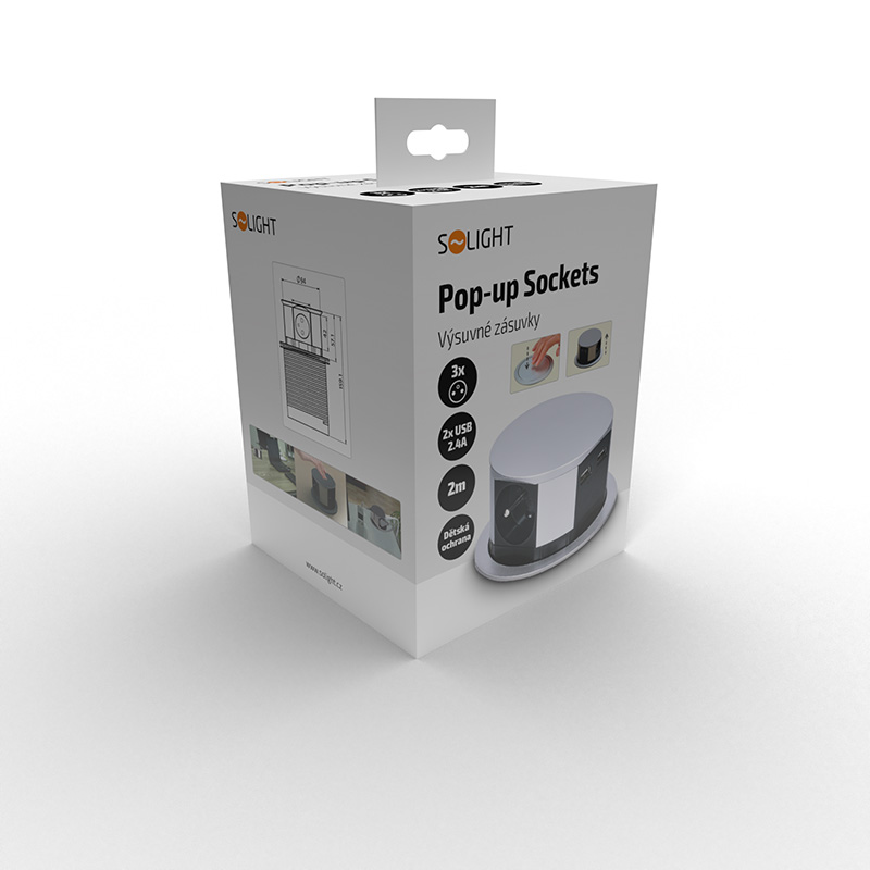 Solight PP100USB výsuvný blok zásuvek, 3 zásuvky, 2x USB, kruhový tvar nízký, prodlužovací přívod 1,5m, 3x1mm2, stříbrný - výsuvný blok se zásuvkami pro kuchyňské linky nebo pracovní desky v kanceláři či dílně - elegantně schovaný, vysune se pouze v p