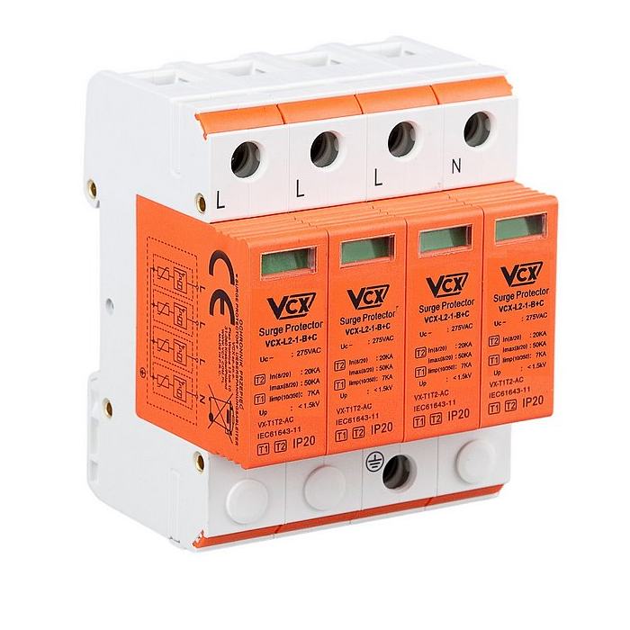 Současně poskytují dvoustupňovou úroveň ochrany. Použití modulárních přepěťových ochran VCX L2-1-B+C 7kA třídy T1T2 nevyžaduje použití oddělovacích tlumivek. Poskytují účinnou ochranu počítačů, spotřební elektroniky/spotřebičů atd. Jsou vybaveny vizuálním indikátorem provozu (zelená - ochrana, červená - bez ochrany).