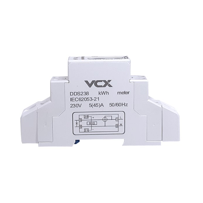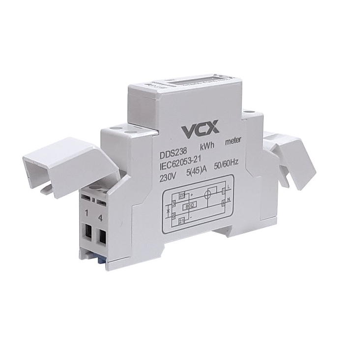 Elektroměr na DIN lištu jednofázový, jednosazbový 230V/50Hz, VCX DDS238 digitální měřič spotřeby elektrické energie. Proudový rozsah 0,25-45A, rozsah měření od 00000,1 až 99999,9 [kWh], LCD displej 5+1 znaků.