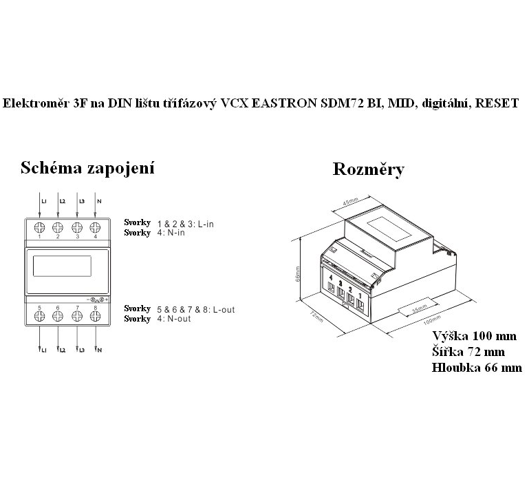 Elektroměr 3F na DIN lištu třífázový VCX EASTRON SDM72 BI, MID, digitální, RESET