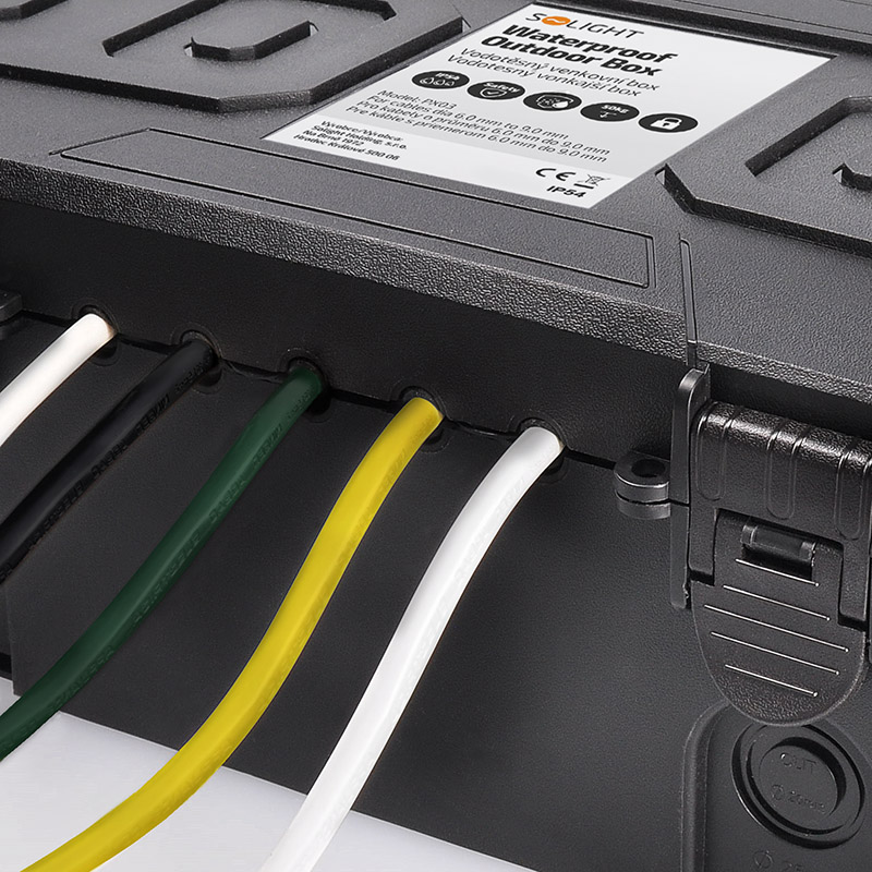 Voděodolná a prachotěsná krabice třídy IP54 je bezpečná ochrana před poškozením kabelových spojení. Uschová prodlužovací přívody, napájení nebo rozbočení anténních a internetových rozvodů, vánočního osvětlení, časové spínače, apod. Zabraňuje oxidaci konektorů a zkratům vlhkem, chrání před nečistotami. Uzamykatelné víko chrání kabelové spoje před rozpojením nebo poničením cizími osobami. Lze použít s elektrickými zařízeními ve venkovním i vnitřním prostředí.