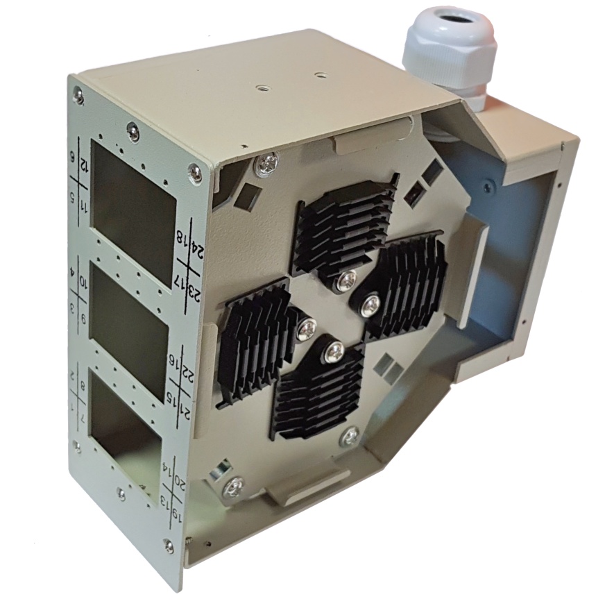 Optický box na DIN lištu kovový pro zakončení či provaření až 24 vláken. Čelo 12x SC duplex , vybavený držáky svárů - 2ks 6 sv. , kabelová průchodka PG16 2ks, 2x záslapka