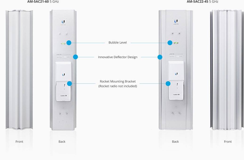 AirMAX ac 2 x 2 MIMO sektorová anténa s označením AM-5AC21-60 se vyznačuje 21 dBi anténním ziskem, zvýšenou odolností proti rušení, eliminací bočních laloků a úzkým vyzařovacím úhlem 60°. To vše má za následek zlepšení parametru SNR (odstup signál-šum), který pomůže při navázání vyšších modulačních rychlostí a větší propustnosti k připojeným klientům.
