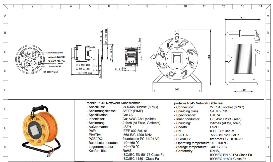 Vysoce kvalitní, stíněný, bez halogenů (LSZH) CAT 7A S/FTP kabel, umístěný na robustní přenosné cívce s možností odvíjení. Kabel je ideální pro mobilní použití, jako je například na akcích, prezentacích či školeních. Ideální pro krátkodobé LAN připojení na dlouhé vzdálenosti, jako je měření sekcí nebo ve venkovních přenosových vozech.