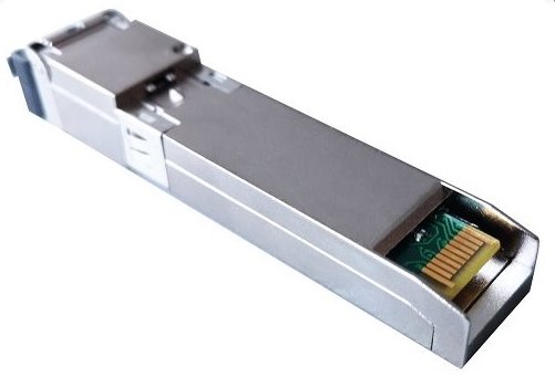 Optický modul formátu SFP pro GPON OLT zařízení ITU-T G.984.2, přenosová rychlost vysílání 2488 MB/s a příjem 1244 MB/s, vlnová délka 1490 nm/1310 nm, SC/UPC konektor, umožňuje obousměrnou komunikaci po jediném optickém vlákně s dosahem 20 km. Stříbrná.