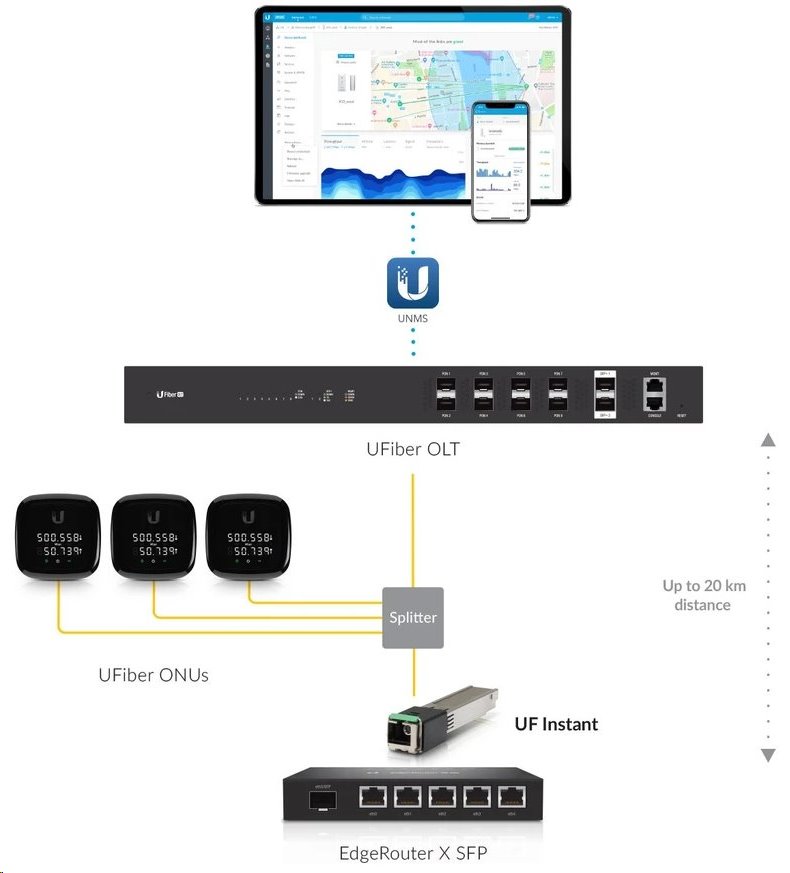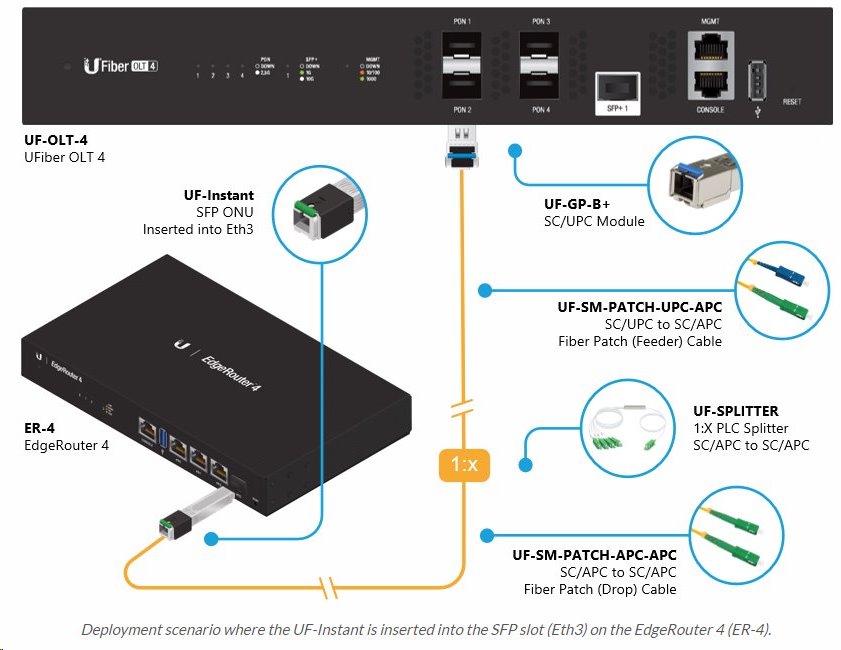 UF-Instant je GPON SFP modul s jedním SC konektorem a je určený do Ubiquiti jednotek řady EdgeSwitch, EdgeRouter, UniFi Switch a USG nebo s produkty UF-AE a F-POE-G2. Modul je určený pro trasy dlouhé až 20 km a je schopen komunikovat s OLT jednotkou asymetrickou rychlostí 2,4 Gbps download a 1,2 Gbps upload.