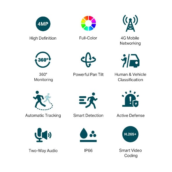 Venkovní kamera, rozlišení 4 MPx, připojení 4G, slot pro SD kartu s kapacitou až 512 GB. Čistý obraz i ve večerních hodinách, plnobarevné noční vidění. Rozlišení lidí a vozidel. Hlasový interkom a siréna. Snadná správa díky aplikaci VIGI.