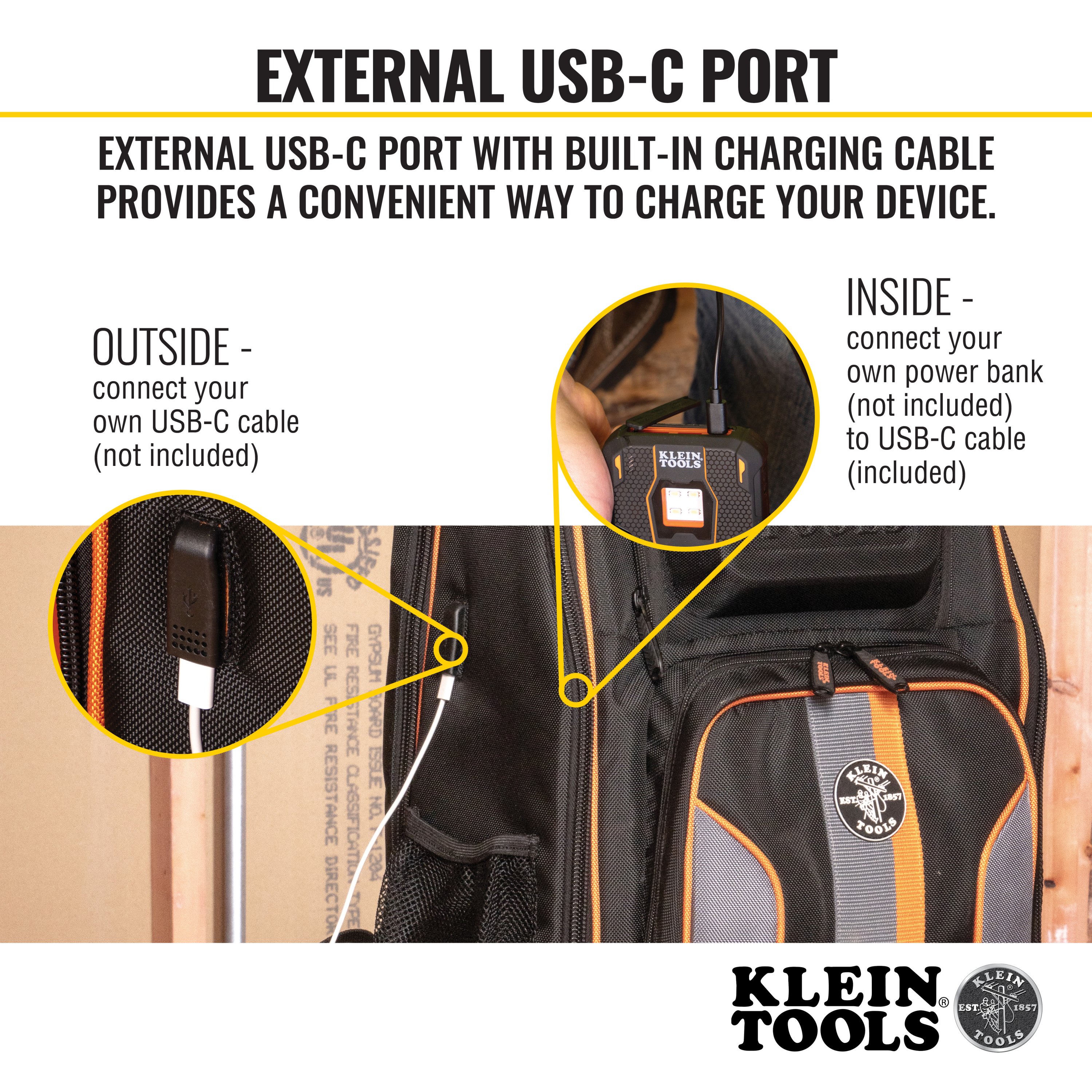 Vnější port pro nabíjení zařízení vně batohu na nářadí