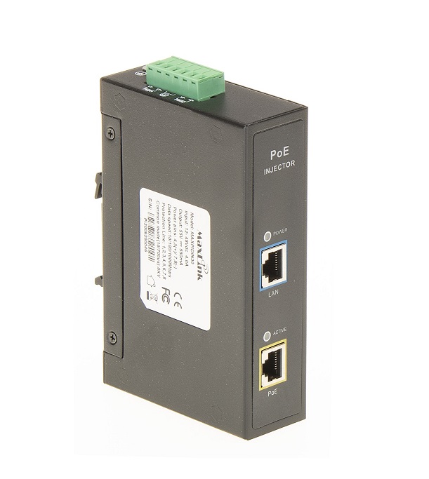 MaxLink MAXPIDIN30 je aktivní PoE injektor s montáží na DIN lištu se vstupním DC napájením 12 až 48V a vestavěným měničem napětí. Výstupem tohoto zdroje je Gigabitový port s podporou 802.3af/at PoE (55V) určeným pro WiFi, VoIP či bezdrátová pojítka. PoE je distribuováno po pinech 4,5(+) a 7,8(-). Druhý Gigabitový LAN slouží jako vstup pro data. Celkový výkon zdroje je 30W. Výhodou zdroje je 6kV (10/700us) přepěťová ochrana.