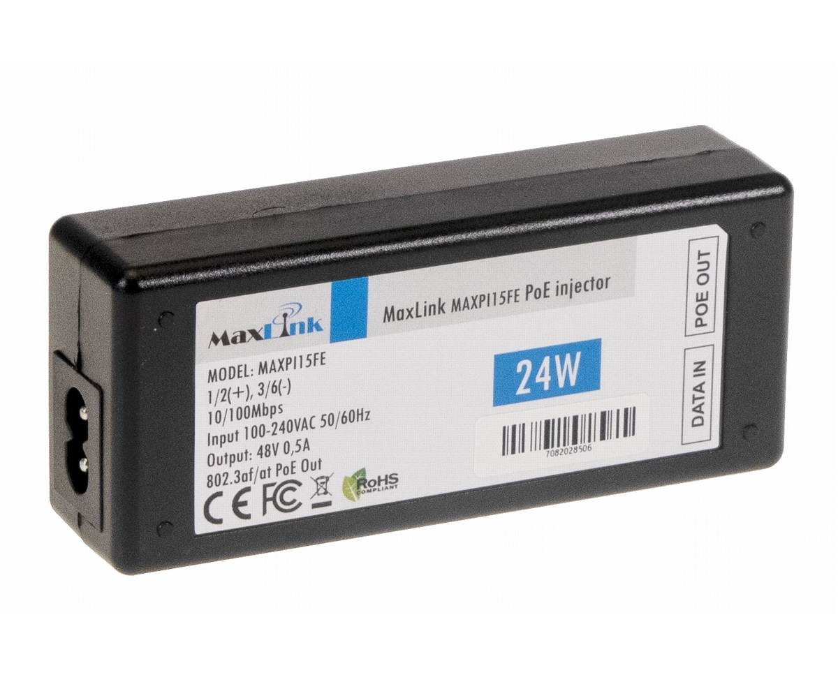 MaxLink MAXPI15FE je velmi jednoduchý 100Mbps PoE injektor s jedním výstupním POE portem pro napájení zařízení s podporou 802.3af s maximální spotřebou až 24W, výstupním napětím 48V a proudem 0,5A. Maximálně udávaný výkon 24W je kompromisem mezi 802.3af (15,4W/port) a 802.3at (30W/port) normou, což je optimální pro zařízení s max. spotřebou okolo 18-20W. Napájení je vedeno po vodičích 1,2 (+) a 3,6 (-) a napájecí injektor je vhodný zejména pro napájení IP kamery, VoIP telefony atp. Součástí balení je i 2-pinový napájecí kabel.