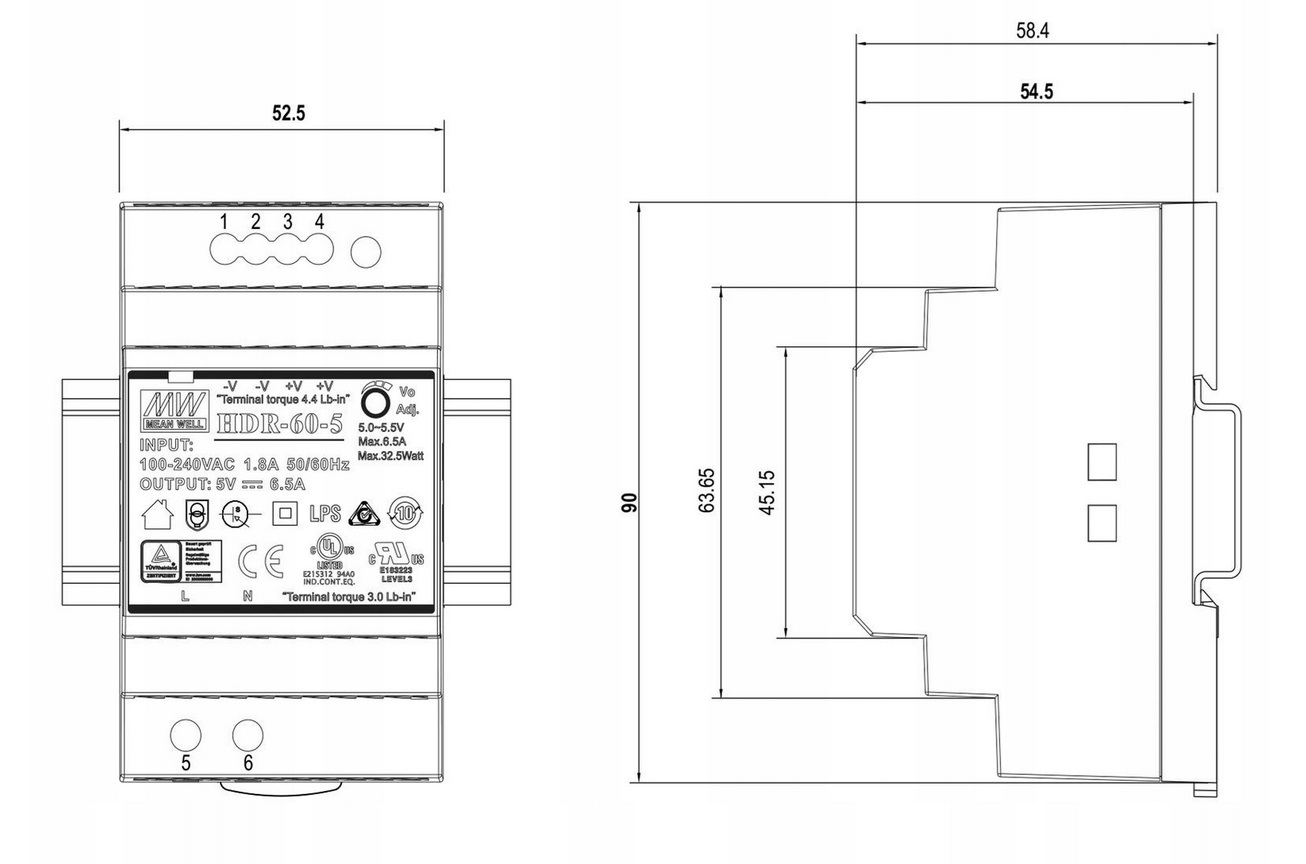 MEAN WELL HDR-60-5 Průmyslový napájecí spínaný zdroj 5V 32,5W na DIN