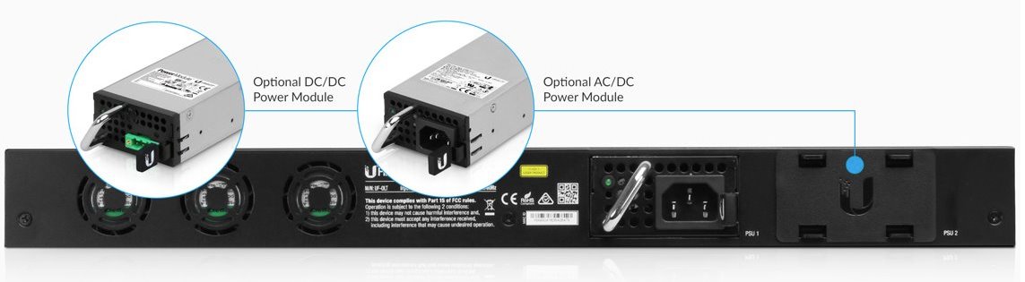 UF-OLT je standardně dodáván s jedním AC/DC napájecím modulem a jednou volnou šachtou pro druhý napájecí modul. Tato šachta lze osadit stejným AC/DC nebo DC/DC modulem, viz související produkty.