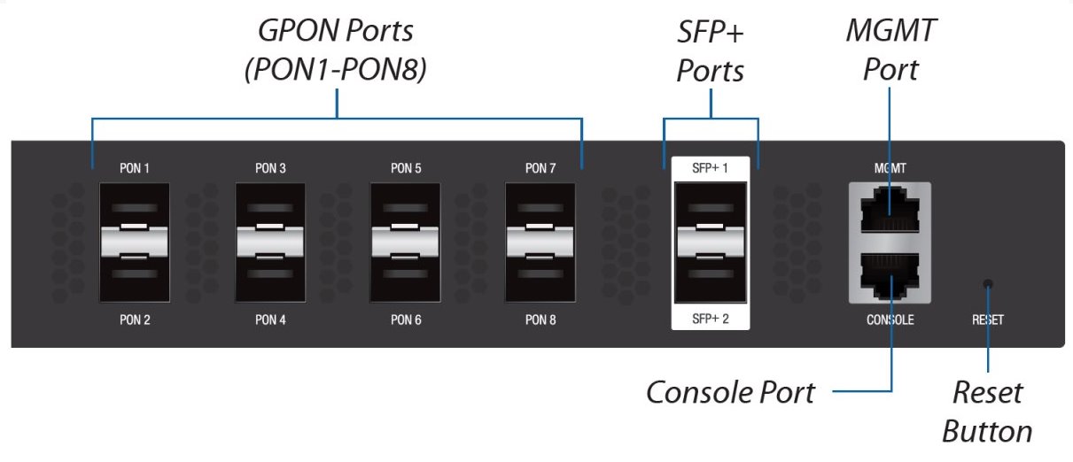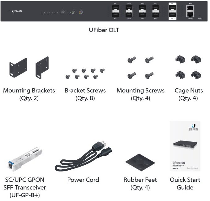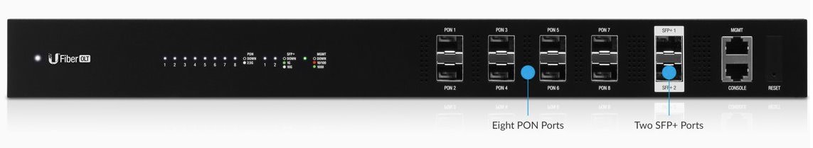 UFiber OLT nabízí 8 GPON portů a podporuje až 128 klientů na port, celkově až 1024 souběžných klientů s fyzickými linkami do vzdálenosti 20 km. Dva SFP+ porty s rychlostí 10G, jeden ethernetový port určený pouze pro management a jeden konzolový port.