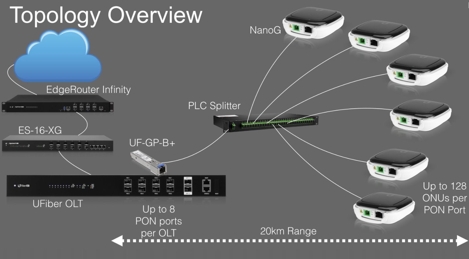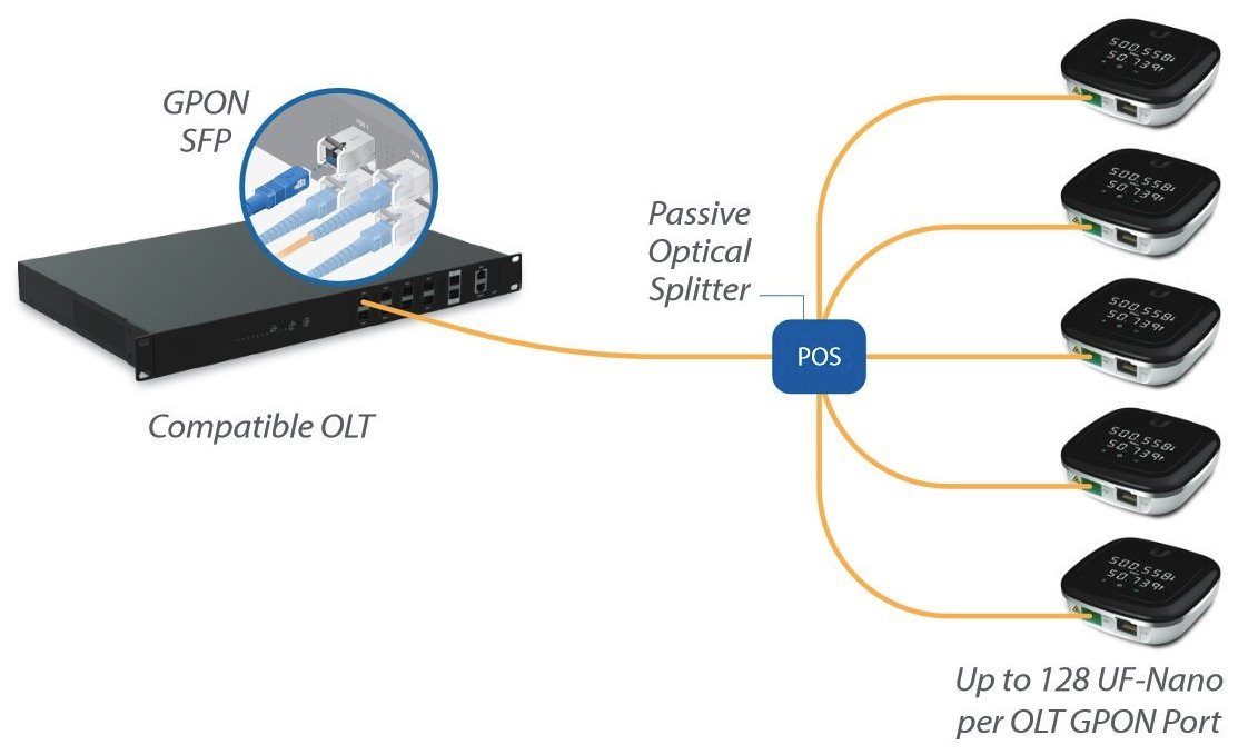 UFiber OLT nabízí 8 GPON portů a podporuje až 128 klientů na port, celkově až 1024 souběžných klientů s fyzickými linkami do vzdálenosti 20 km.