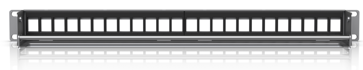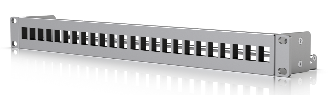 Neosazený panel s 24 pozicemi, stříbrná barva, keystone design, možnost doplnění záslepek, montáž do běžného 19" rozvaděče, výška panelu 1U.