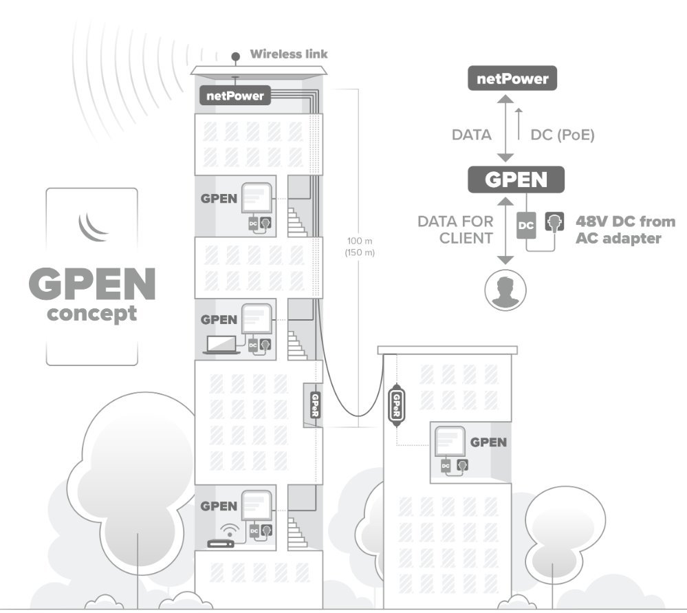 GPEN21 je nástěnný PoE injektor se SwOS managementem, jedním SFP portem, dvěma Gigabitovými porty, z čehož jeden poskytuje pasivní PoE a napájecím DC konektorem se vstupním napětím 12 až 57 V DC.