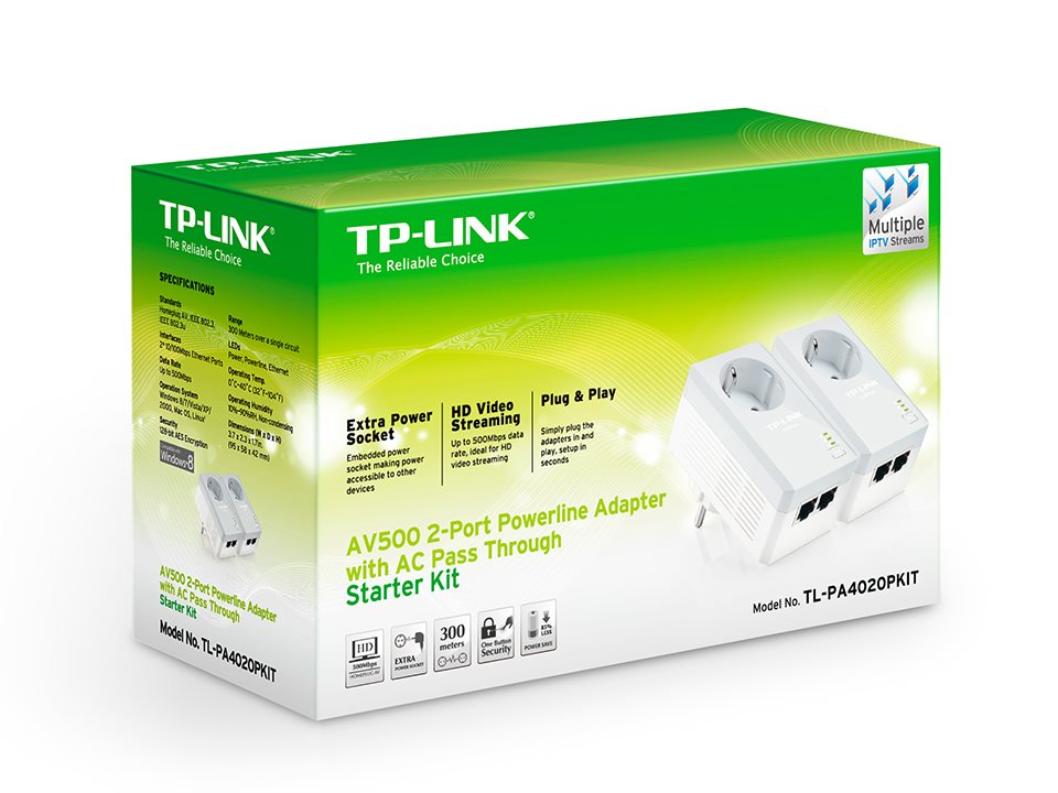 Sada TL-PA4020PKIT přemění vaši stávající elektrickou síť na vysokorychlostní internetovou síť bez nutnosti dalších kabelů či vrtání do zdi. Zásuvka je vybavená 2x LAN portem a díky rychlosti až 500 Mbit / s a elektrickému rozvodu v domácnosti o délce až 300 m je skvělou volbou pro snadné vytvoření multimediální sítě.