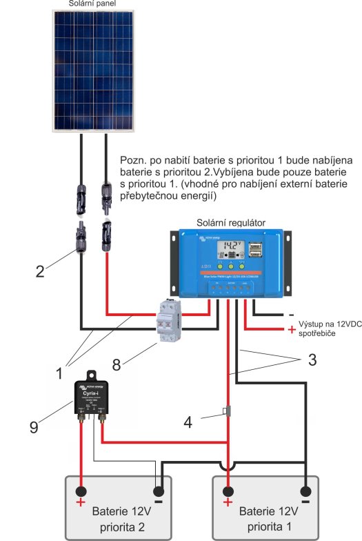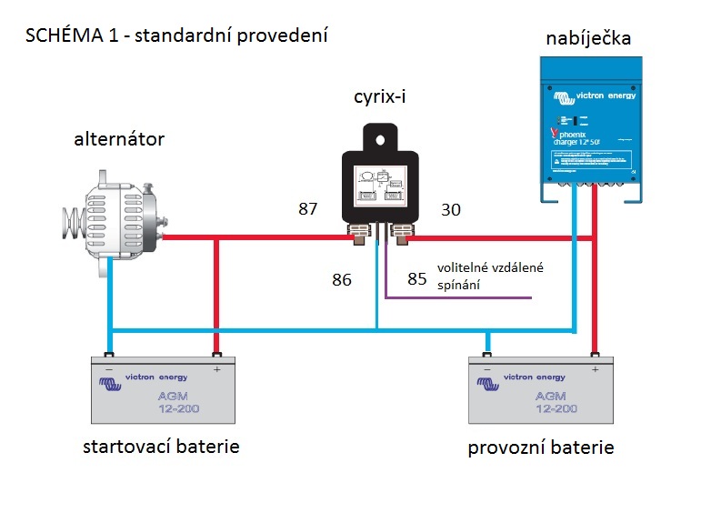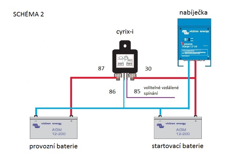 Inteligentní propojovač baterií Cyrix-CT kontroluje a řídí nabíjení, odpojování startovací a provozní baterie. Pokud se na jedné z baterií dosáhne napětí 13,0 V (26 V) po dobu 10 minut nebo 13,8 V (27,6 V) po dobu 4 sekund, Cyrix-ct obojí baterie propojí a nabíjejí se obojí baterie současně do plného stavu.