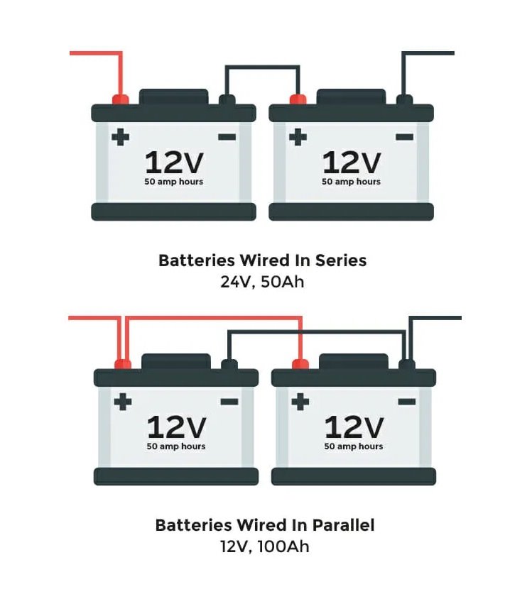 Propojovací kabely - 1x černý, 1x červený, zakončený očky na obou stranách je ideální k propojování baterií, měničů napětí, atd...se závitem M6. Propojením více baterií můžete zvýšit výstupní napětí (sériové zapojení) nebo celkovou kapacitu (paralelní zapojení).