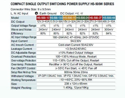 Parametry a specifikace: - AC Rozsah vstupního napětí zvolen pomocí přepínače; - Nízká hmotnost, vysoká účinnost; - Ochrany: Zkratu / proti přetížení / přepětí / teplotní; - Chladicí ventilátor ON-OFF automatické regulace; - LED indikátor zapnutí; -