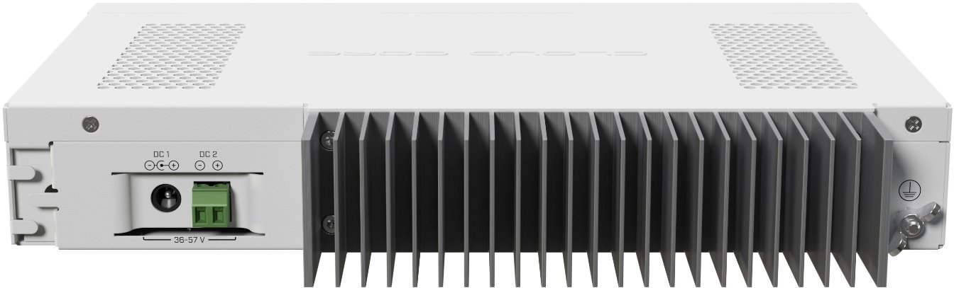 Na routeru najdete 16 Gigabit LAN portů, 2 SFP+ sloty a jeden sériový port typu RJ45. K zařízení zapojíte i 1G a 10G moduly. Na zadní straně se nachází pasivní chladič a dva DC vstupy se vstupním napětím 36 až 57 V (svorkovnice a konektor).