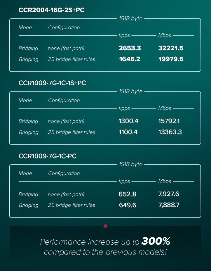 Výkonný desktop/rackmount router, jeden z nejvyšších poměrových výkonů na 1 jádro mezi CCR routery, CPU 1200 MHz, 4 jádra, 4 GB RAM, 128 MB NAND, 16x Gigabit LAN port, 2x SFP slot, operační systém RouterOS L6, pasivní chlazení.