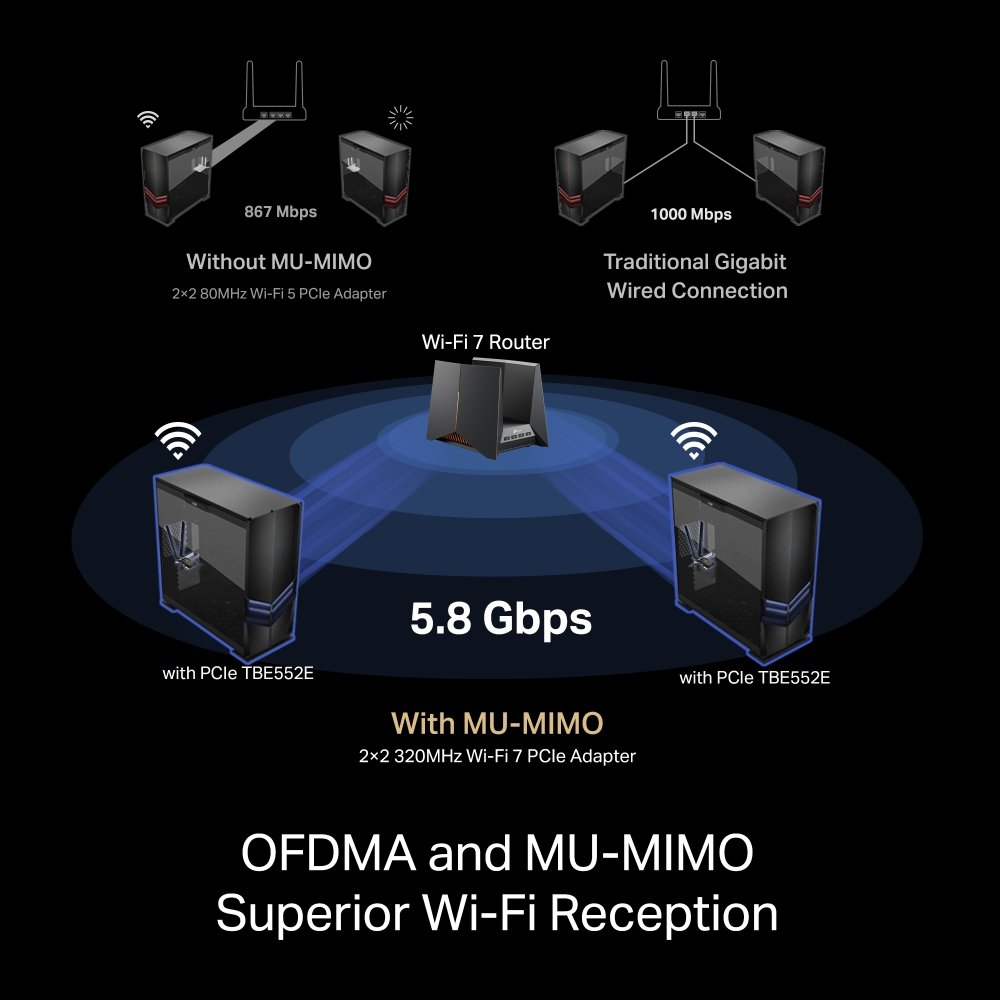 Užijte si nerušené streamování a plynulý chod aplikací. Díky zrychlené propustnosti, nižší latenci a silnější ochraně proti rušení si vychutnáte špičkový výkon standardu Wi-Fi 7. Technologie Bluetooth 5.4 zajistí širší pokrytí a vyšší rychlost všech vašich připojených zařízení, od sluchátek až po herní ovladače.