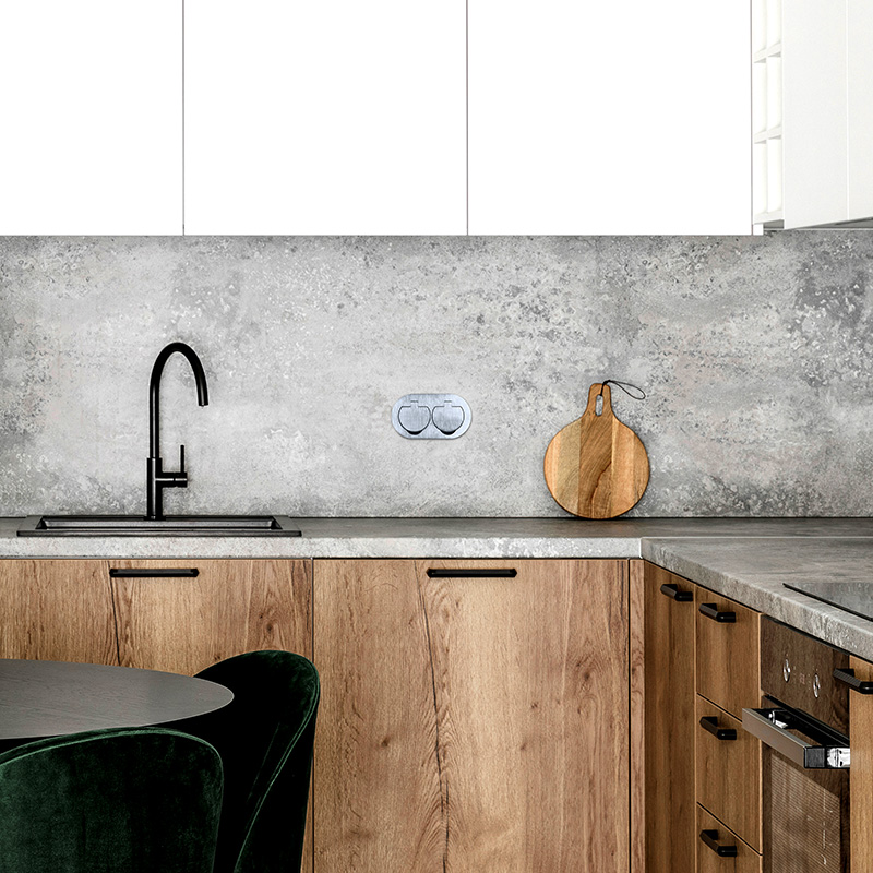 Vrchní kryt zásuvky je vyroben z odolné zinkové slitiny, která zajišťuje pevnost a zároveň ochranu proti korozi. Na povrchu nejsou viditelné žádné šrouby – montážní otvory zůstávají skryté pod každým víčkem. Díky tomu působí zásuvka elegantně a profesionálně a zároveň se snadno čistí.