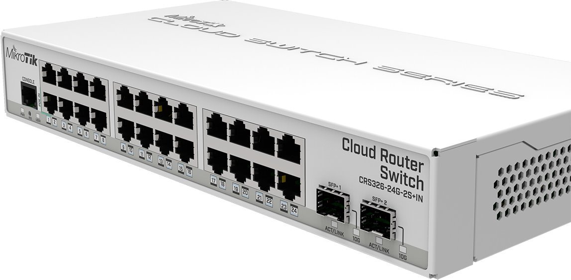 CRS326-24G-2S+IN je nová desktopová verze s tzv. "Dual boot", které umožňuje spuštění s klasickým RouterOS nebo SwOS. 24 GLAN porty (10/100/1000) s podporou pasivního PoE na prvním portu, dvojicí SFP/SFP+ portů.