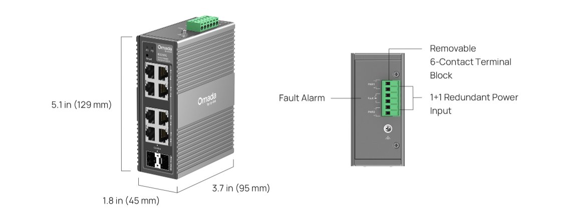 Průmyslový switch od značky TP-Link, 8× GLan, 2× SFP Combo, snadné začlenění do platformy Omada SDN, provozní teplota -40 až 75 °C, krytí IP40, možnost montáže na DIN/stěnu, VLAN, QoS, redundantní napájení.