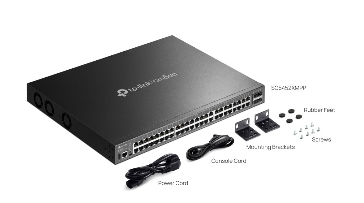 Spravovaný L3 PoE++ switch TP-Link SG5452XMPP je navržen pro vysokou hustotu připojení, maximální napájecí výkon a robustní správu v podnikových sítích i u ISP. Nabízí 48 gigabitových PoE portů (8× PoE++ až 90 W a 40× PoE+ až 30 W), 4× 10Gbps SFP+ uplinky, 770W PoE rozpočet a fyzické stohování až 4 jednotek. Podporuje Perpetual PoE, Fast PoE, pokročilé směrování L3, ochranu v kruhové topologii (ERPS) a centralizovanou správu přes Omada SDN.
