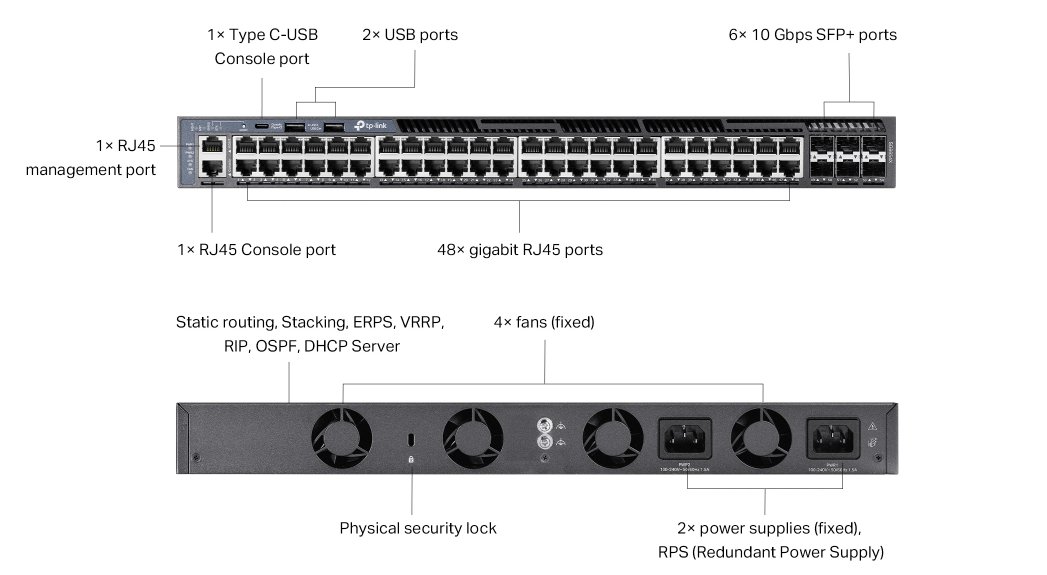 Switch poskytuje celkem 48 RJ45 gigabitových portů a 6 SFP+ slotů, které lze využít nejen jako uplink, ale i pro fyzické stohování až 8 jednotek. S přepínací kapacitou 216 Gb/s je připravený zvládnout vysokou síťovou zátěž.