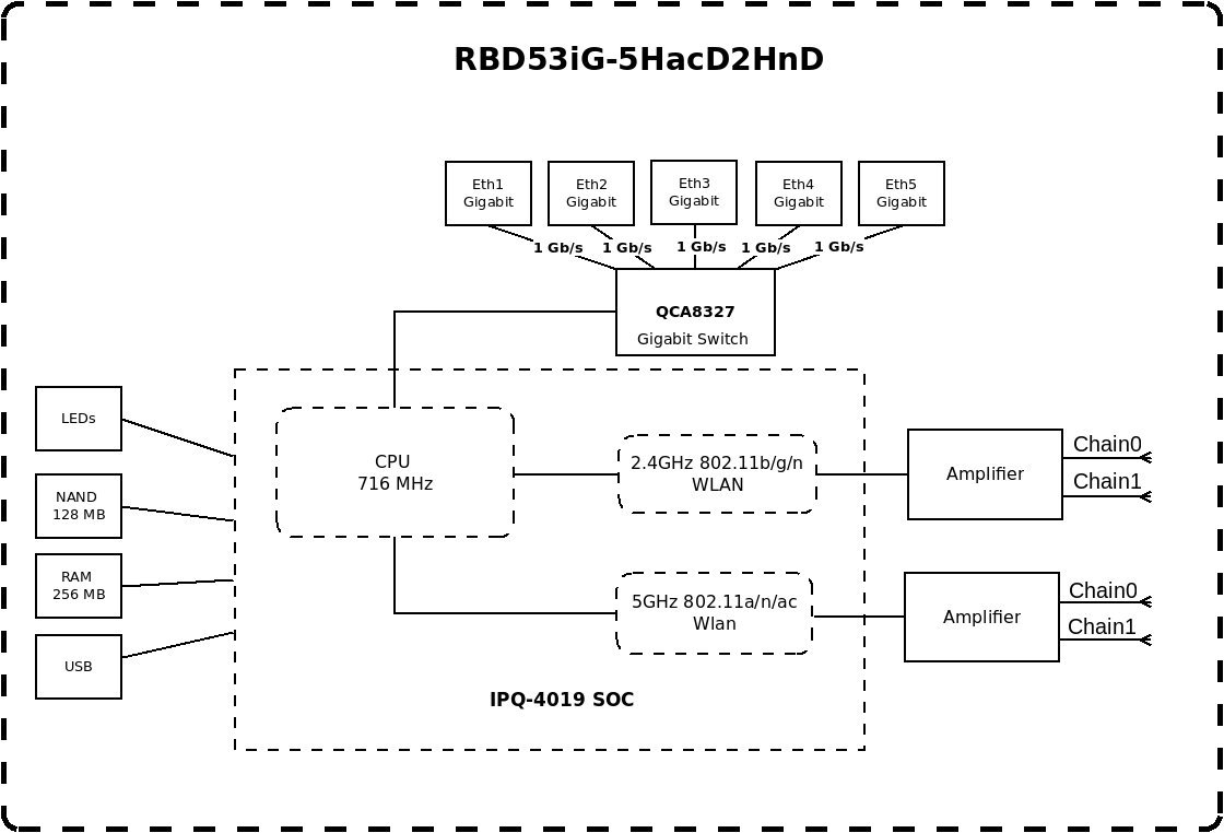 Dvoupásmový WiFi router s celkem pěti Gigabitovými ethernety, přenosová rychlost 300 / 866 Mbps v pásmu 2,4 / 5 GHz, 256MB RAM a čtyřjádrovým procesorem. USB port pro možnost rozšíření úložiště.