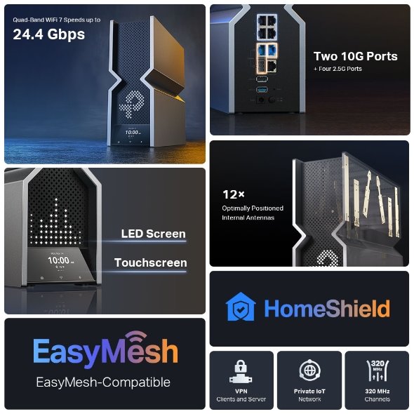• Pokročilé funkce: 320MHz kanál, 4K-QAM, kompatibilita s EasyMesh, IoT Network, spolupráce s Google Assistant a Alexa)