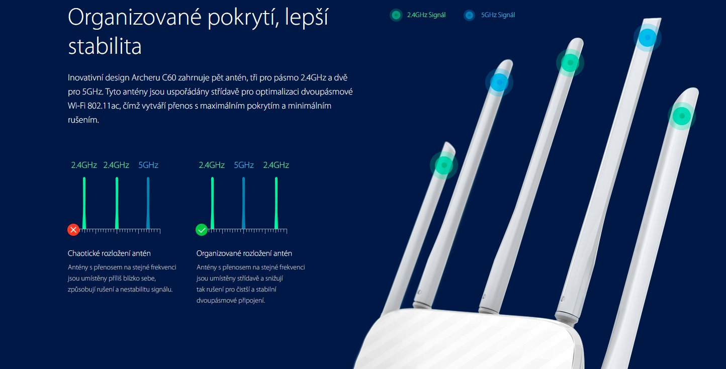 Archer C60 vám poskytuje souběžná dvoupásmová Wi-Fi připojení. Pásmo 2.4GHz: 3x3 MIMO vytváří rychlou a stabilní Wi-Fi na rychlostech 450Mbit/s, což ho dělá dokonalým pro každodenní použití, jako je odesílání e-mailů, prohlížení webů nebo poslech hudby. Pásmo 5GHz: Poskytuje Wi-Fi až 867Mbit/s pro zábavu citlivou na dobu odezvy, takže můžete streamovat HD video, hrát on-line hry a bavit se na video chatu ve stejnou dobu bez prodlev.