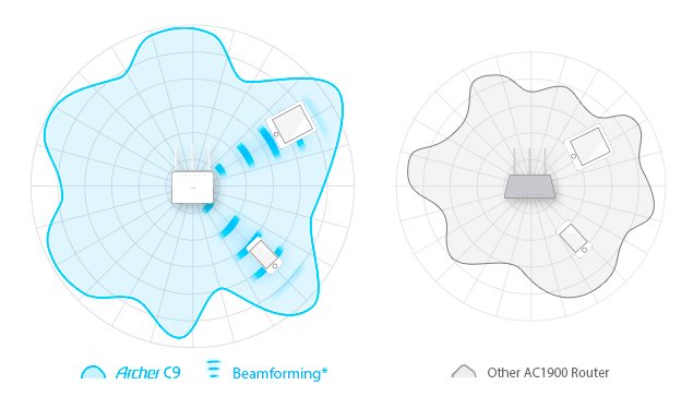 Super rychlé přenosové rychlosti zajišťují dokonalé možnosti bezdrátového připojení Archer C9, je vybaven další generací bezdrátového standardu 11ac, který umožňuje celkovou přenosovou rychlost až 1,9 Gbit/s. Díky rychlostem 1,3 Gbit/s v nerušené frekvenci 5 GHz a maximálnímu výkonu 600 Mbit/s v pásmu 2,4 GHz, jehož je dosahováno pomocí dvou čipů, bude mít celý váš domov vynikající pokrytí bezdrátové sítě.