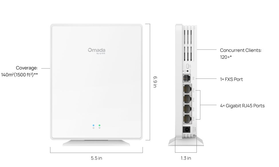 Přístupový bod, montáž na stůl nebo stěnu. Wi-Fi 6 s rychlostí až 1,8 Gbit/s, dlouhý dosah, MU-MIMO, OFDMA. Centralizovaná správa Omada SDN. 4x Gigabit Ethernet port, 1x FXS port, 1x GPON port.