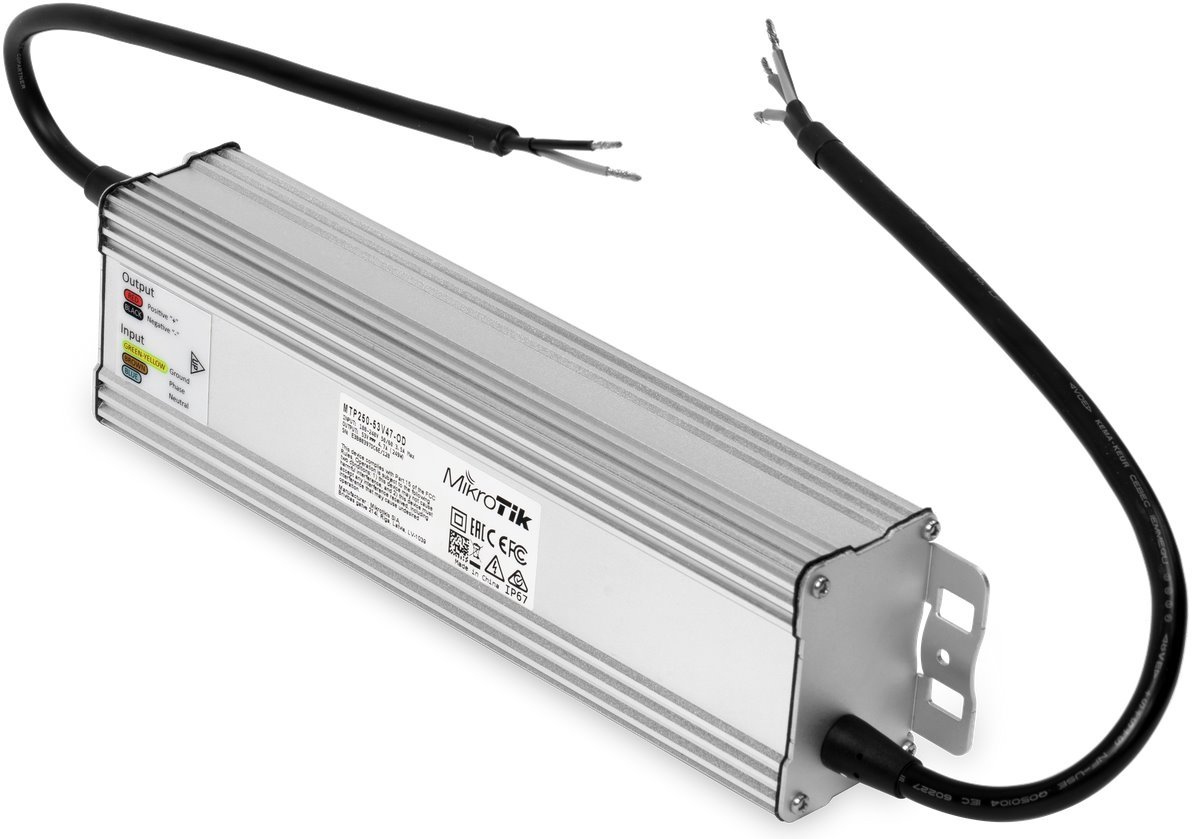 Venkovní AC/DC napájecí zdroj pro produktovou řadu MikroTik netPower, certifikace IP67 proti prachu, vlhkosti a vodě, slouží ke transformaci nízkého napětí na malé napětí, výstupní napětí a proud 26 V / 9,4 A, celkový výkon 250 W. Stříbrná barva.