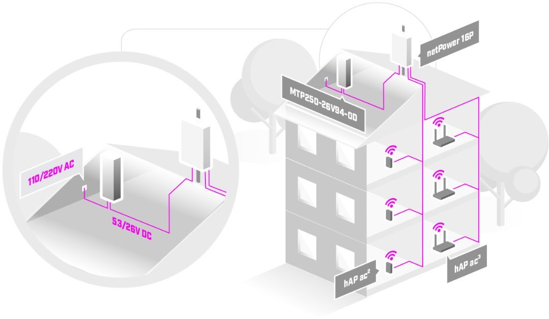 Venkovní AC/DC napájecí zdroj Mikrotik MTP250-26V94-OD pro produktovou řadu netPower je umístěný v odolném kovovém šasi s možností uchycení na zeď, které se pyšní certifikací IP67 proti prachu, vlhkosti a vodě. Na rozdíl od ostatních napájecích zdrojů nepotřebuje instalační krabici díky svému vodotěsnému provedení. Zdroj slouží ke transformaci nízkého napětí na malé napětí, kdy pracuje s výstupním napětím 26 V, výstupním proudem 9,4 A a s celkovým výkonem 250 W, takže se hodí například pro napájení přístupových bodů a dalších síťových prvků. Zdroj je pak zakončen 2 odholenými kabely bez konektorů – vstupní 3žilový AC kabel a výstupní DC kabel.