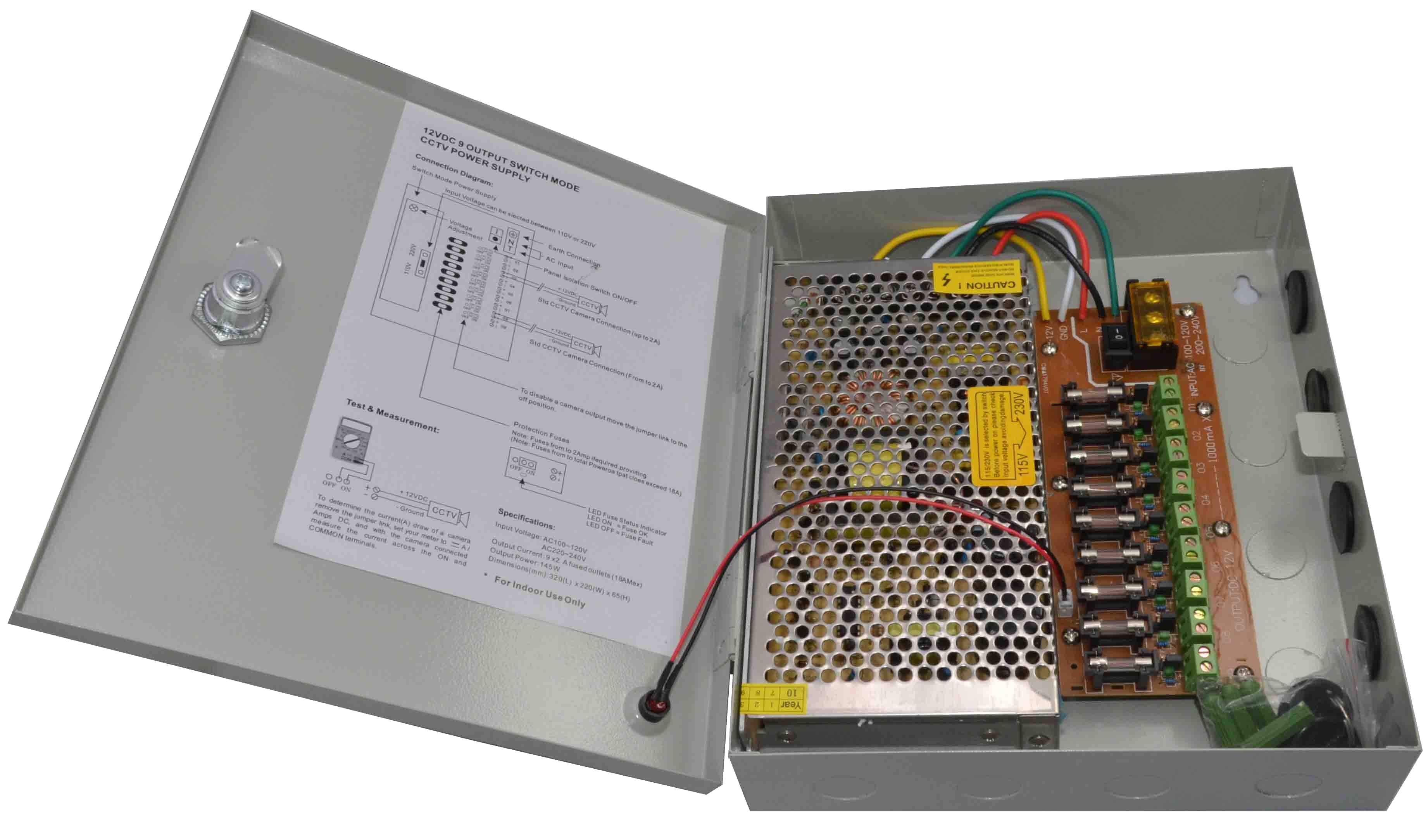 Napájecí zdroj 230V - 12V/10A 9 výstupů v krytu s průchodkami. Pojistka 2A / výstup. Maximální celkový výstupní proud 10A šxvxh 205x240x55mm